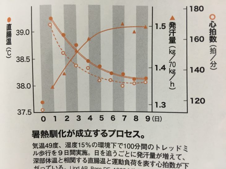 そもそも暑熱訓化のメカニズムとして、眠っていた汗腺が蘇って、能動汗腺の一つ一つの能力が上がり、発汗量が平均20%ほど増えて体温を下げる能力が上がるそうです。