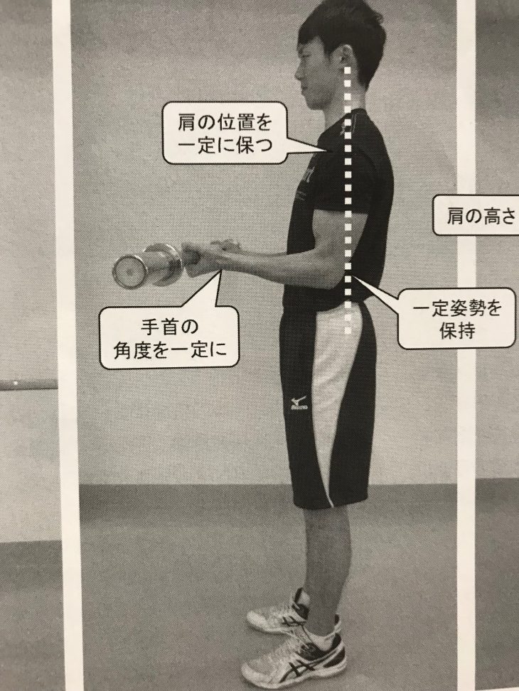 ダンベルカールでダンベルを上げきったときは、小指と親指は小指が親指より上にきている位に、手が絞れていると良いです。